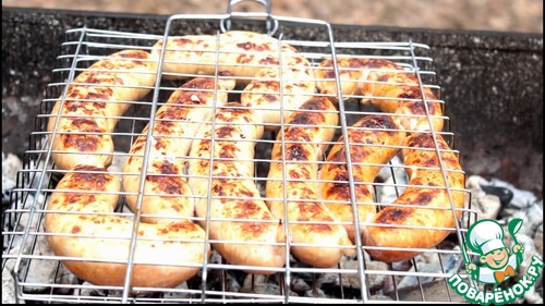 Решетку смазываем растительным маслом, так колбаски не прилипнут к решетке. Выкладываем не очень плотно и жарим с двух сторон до золотистого цвета. У нас ушло примерно минут 5 - 10 на каждую сторону. Колбаски стоит выкладывать на мангал, когда самый большой жар прошел и угли покрылись белым пеплом и приобрели белесый цвет. На таком жаре они отлично приготовятся и не пригорят.