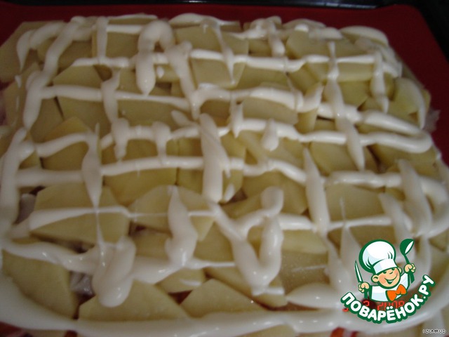 • На помидорно-луковый слой выложить слой картофеля и заправить майонезом.