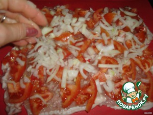 • На мясо выложить слой из помидоров и лука.