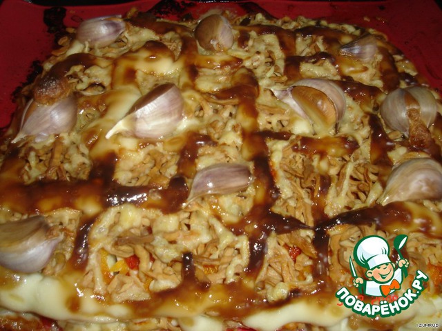 Мясо под шубой и слоeной лапшой