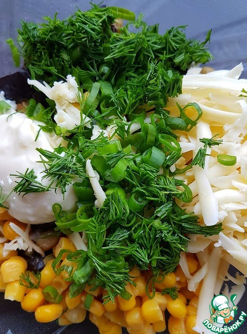 3. В салатницу добавить баклажан, заправку, кукурузу, сыр и мелконарезанную зелень. Тщательно перемешать, дать настояться около 5 минут. Поперчить при желании.