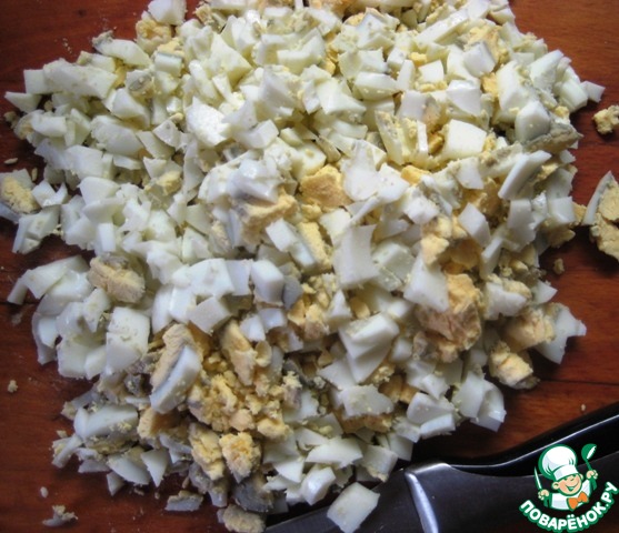 2. яйца, приправить солью и черным перцем по вкусу, смазать слой заправкой.
