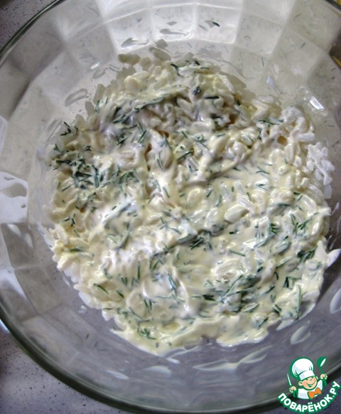 Для заправки салата в отдельной мисочке смешать сметану/майонез/укроп.