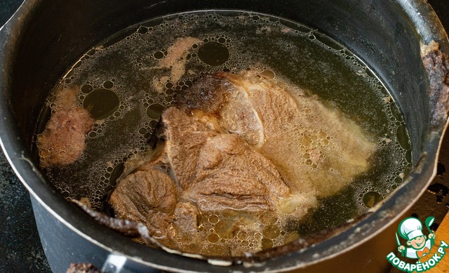 Начинаем приготовление разумеется с мяса. Берём большой жилистый кусок на кости - жира поменьше, а вот жил с костями в этот раз совершенно не стесняемся, бульон от них станет лишь наваристее. Кладём мясо минимум на четыре, а лучше на все пять-шесть часов вариться. Сначала на сильный огонь - чтоб быстрее закипело, а как закипит, огонь ослабляем, и пусть там себе побулькивает.