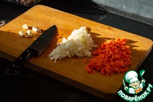 Нарежем лук и морковку, зачистим головку чеснока.