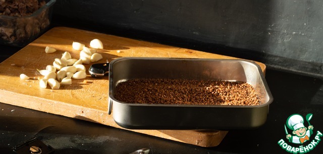Гречку прокалим в духовке - лично у меня это десять минут в духовке на температуре 230 градусов, или пятнадцать на 200. В зависимости от обдува в духовке настройки могут сильно разниться, так что не уверен, что эти данные можно считать твёрдым ориентиром. Гречка должна чуть потемнеть, но чуть - горелая не нужна. На это и ориентируемся.
