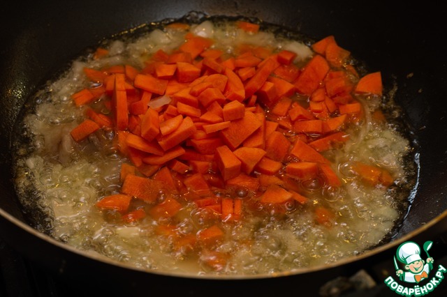 Как поджарится до слабой прозрачности, добавляем морковку. -