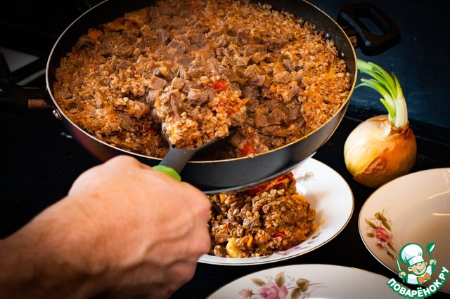 Если не решились прокалить гречку предварительно, можно её положить до мяса и немного пожарить с луком и морковкой. А мы уже прокалили и кладём мясо.