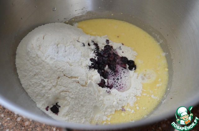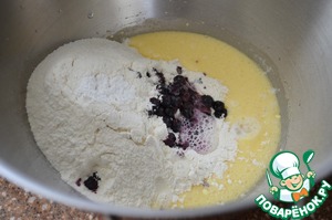 • К сливочно-яичной смеси добавить просеянную муку, ягоду и соду.