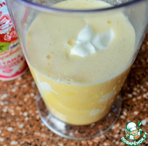 ЗАЛИВКА : Яйца, сахар и муку смешать тщательно венчиком.