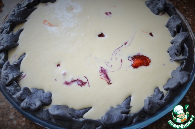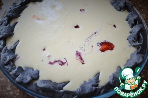 • Вылить в тесто заливку, украсить по бортикам остатками теста.