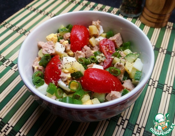 А! Нет! Это сардины в собственном соку с яйцом вареным, точно! Делала такой салат как-то... давно так, что и считать сколько лет назад стыдно будет