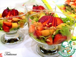 Красочный, по летнему яркий фруктово-ягодный салат с салатными листьями, поджаренными кедровыми орешками, и пикантной заправкой. В весенне-летнюю пору (в сезон клубники), клубнично-манговый салат прекрасно подойдет в виде легкого завтрака, или вечернего перекуса. Приготовьте салат для дружеской вечеринки, удивите своих гостей необычным сочетанием, лёгким вкусом, и красивым видом салата.