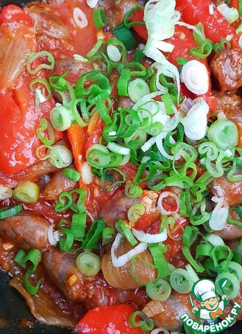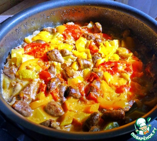 Рецепт «Куриные сердечки с помидорами и перцем»: