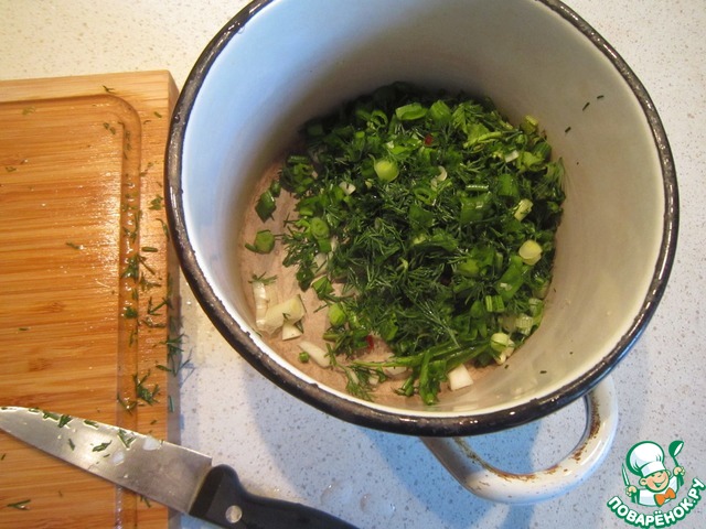 Зелень: петрушка, зеленый лук, укроп - нарезаем очень мелко. В принципе можно добавлять любую зелень, которая есть у Вас, но вот лично я не рекомендую кинзу...