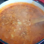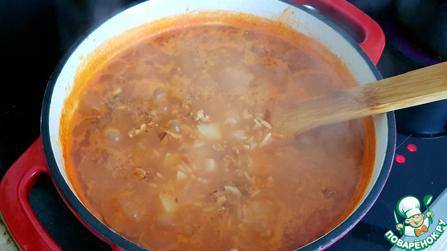 Это рецепт в оригинале, мой муж добавляет еще рис, как только сварится мясо. Риса нужно положить столько, чтобы суп не был слишком густым, на порцию, которую я даю в рецепте, примерно 0, 5-0, 6 стакана. Те, кто любит погуще, положите стакан.