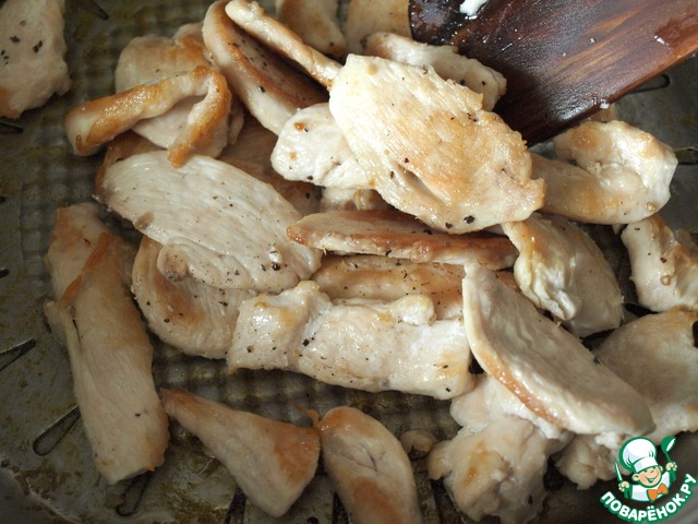 На сильном огне обжарить курочку в разогретом растительном масле пока она зарумянится. В конце жарки добавить соль и перец.