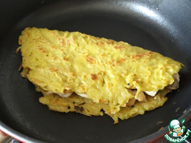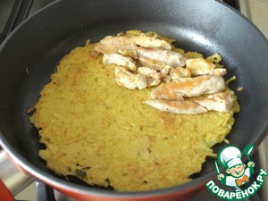 Треть картофельной массы выложить в сковороду, хорошо разогретую с маслом, равномерно распределить по дну. Когда низ прожарится, перевернуть. На половину драника выложить кусочки курицы, также третью часть.