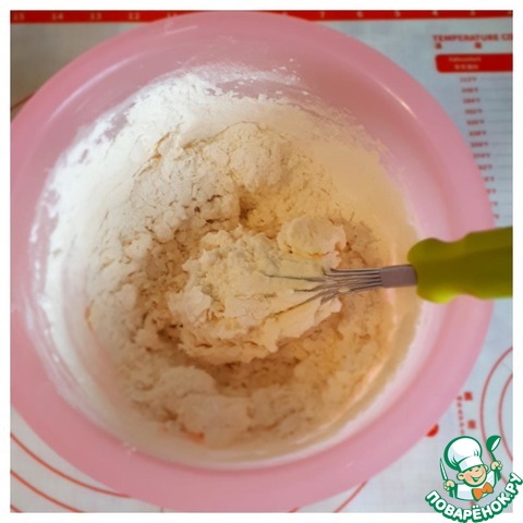 Предварительно просеять муку, смешать ее с солью и разрыхлителем. Добавить муку к взбитой массе и быстро замесить тесто.