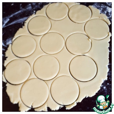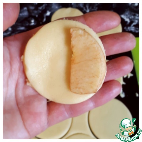 Раскатать тесто в пласт толщиной 5 мм и вырезать кружки. Диаметр кружка зависить от размера яблока. У меня было маленькое яблоко, поэтому вырезала кружочки диаметром 7 см.