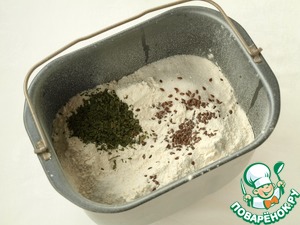 Просеять сверху муку, по углам распределить сахар, соль, сухую петрушку и семена льна.