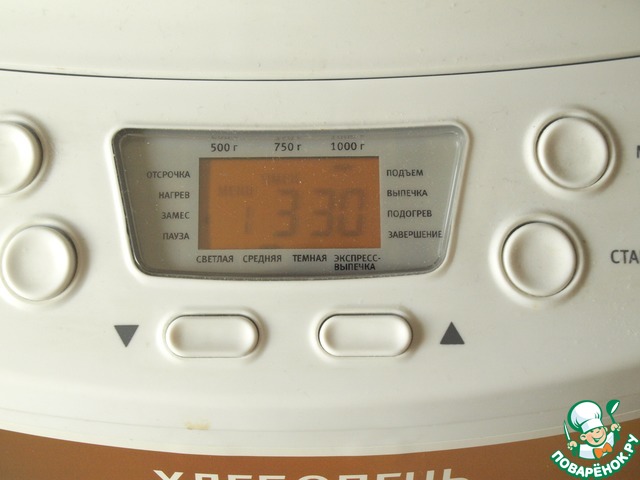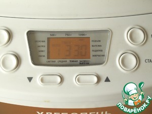 На таймере выставить программу "основной режим", вес хлеба 1 кг, корочка средняя. Запустить программу.