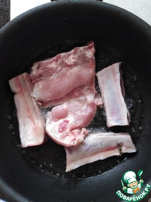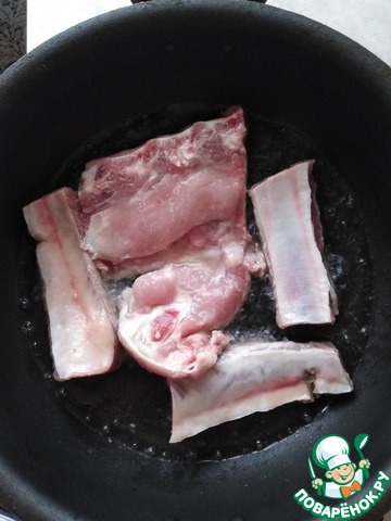 Растопим в казане курдючный жир, если его нет, то подойдёт растительное масло. Режем мясо на хорошие куски, я люблю чтоб мясо было с косточкой, плов получается ароматным. В раскаленый казан с маслом кладём мясо и обжариваем на сильном огне. Рис предварительно промываем и замачиваем на 1 час в воде.