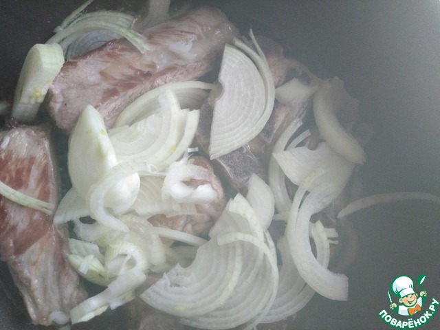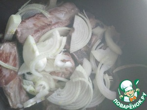 Режем лук полу кольцами и кладём к мясу, обжариваем 5 мин на среднем огне.