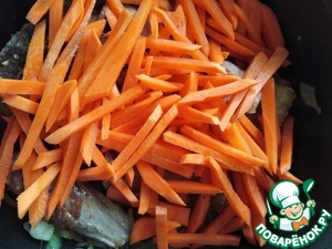 Морковь режем соломкой и кладём в казан к луку и мясу, обжариваем до мягкости моркови.