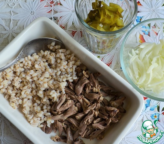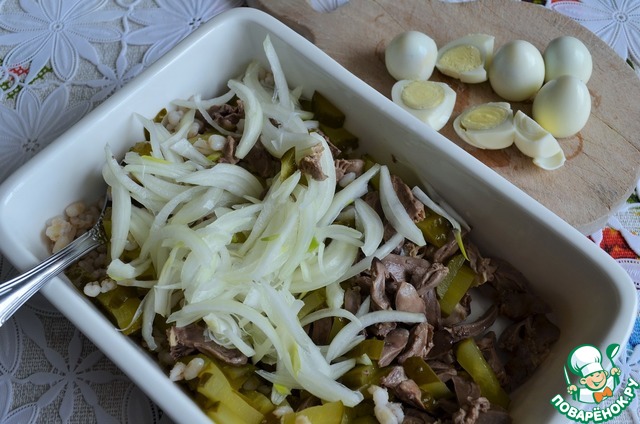 Лук нарезать перьями и залить уксусом, оставить на 10 минут.