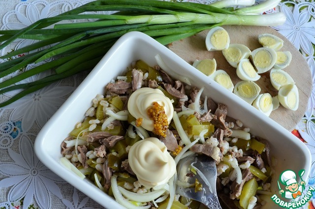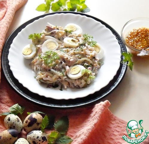 Если Вы любите крупяные салаты, где вместо традиционного картофеля - рис, перловка или другая крупа, значит Вам понравится. Его можно заправить растительным маслом и подать в тёплом виде, нам же больше по вкусу его холодный вариант, с майонезно - горчичной заправкой. Угощайтесь.