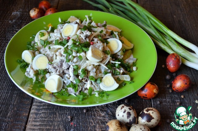 Выложить на блюдо или в салатник, украсить зелёным луком и яйцами.