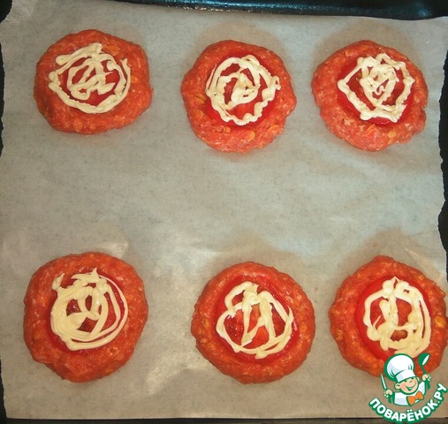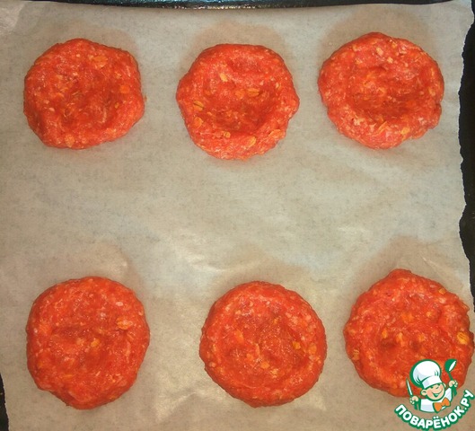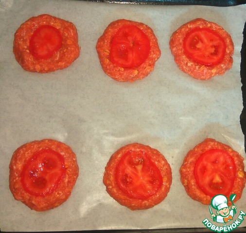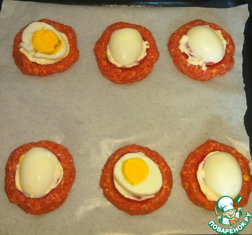 На застеленный пергаментом противень выложить мясные колобки. Немного приплюснуть и сделать в центре небольшое углубление.