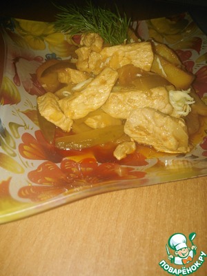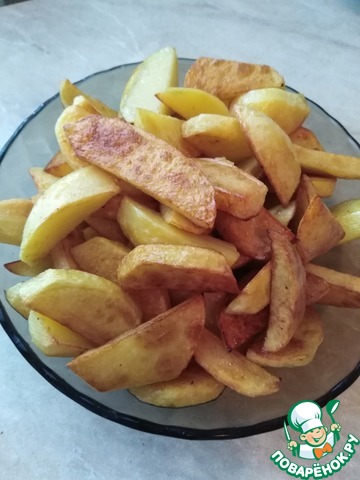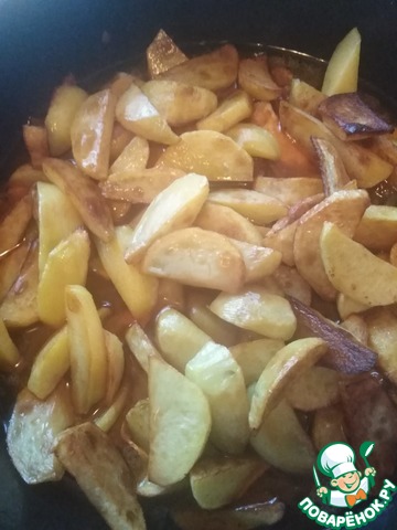 Блюдо достаточно сытное, так как содержит и гарнир в виде обжаренного картофеля, и мясную подливу с овощами.