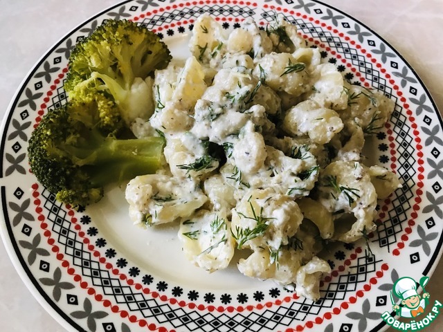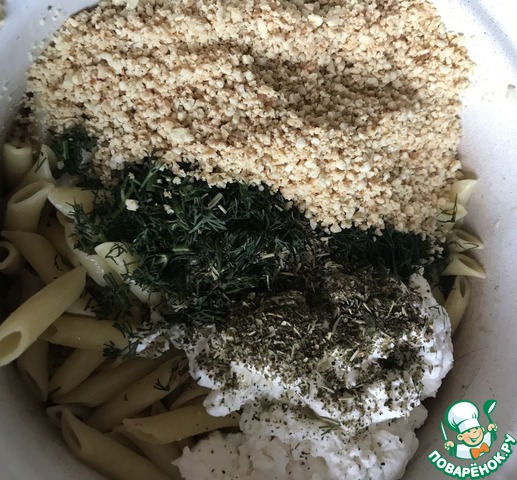 Макароны откинуть на дуршлаг, добавить творог (жирный), зелень, орех, соль и перец. Добавить сметану, перемешать.