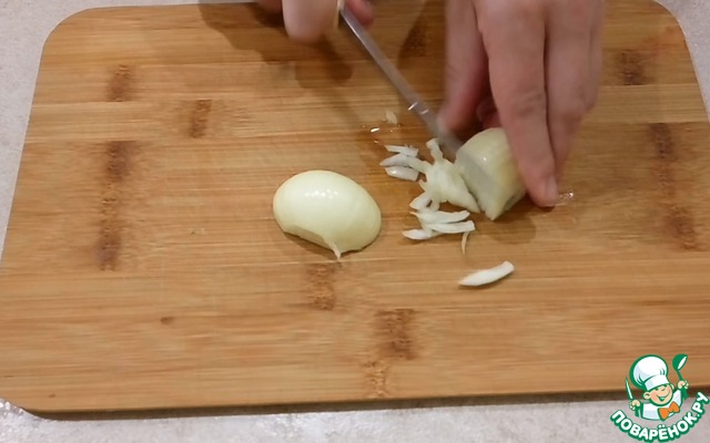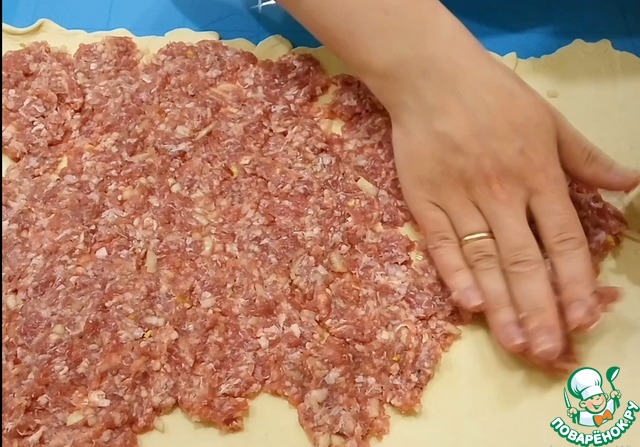 По всей поверхности теста выложите тонким и ровным слоем фарш.