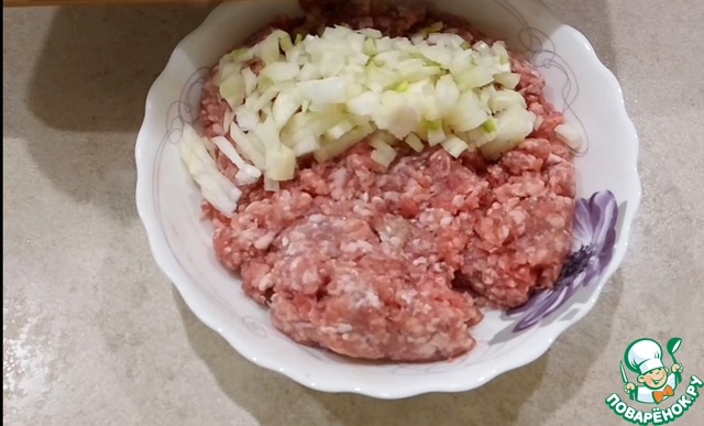 К фаршу добавьте лук. Посолите и поперчите. Все тщательно перемешайте. Можно использовать любой фарш. У меня свино-говяжий.
