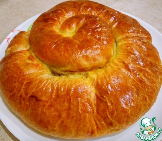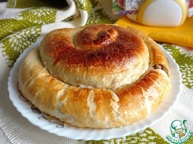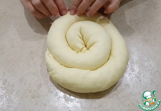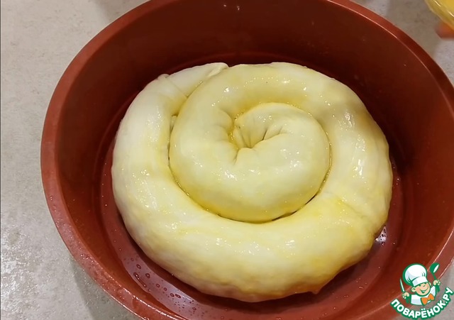 Аккуратно закрутите тесто с фаршем в рулет и выложите его в форму в виде улитки, закручивая по спирали начиная с центра.