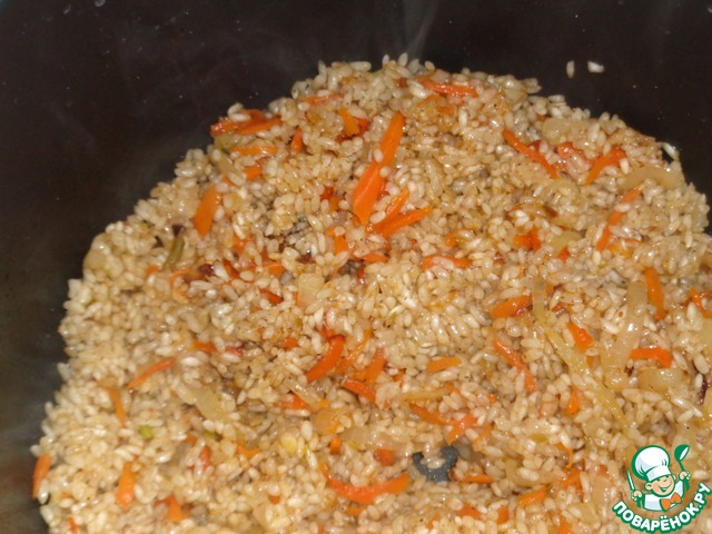 Наливаем 4,5 мультистакана воды. Вода должна покрывать рис примерно на палец. Солим по вкусу. И вот теперь закрываем крышку. Программу не меняю, так и готовлю на "жарке", но если хотите, перейдите на тушение. Периодически крышку открываю и помешиваю.