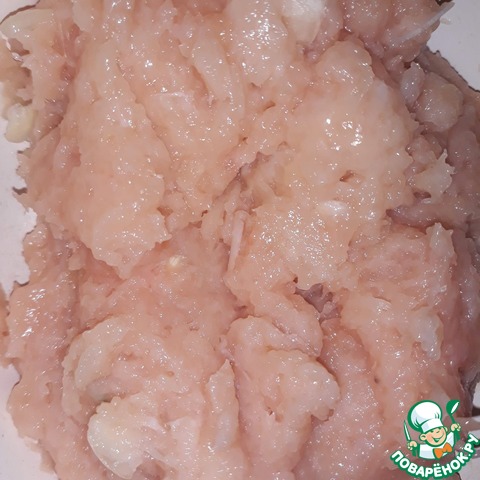Нарезать мелко лук. Измельчить филе в фарш (я использовала блендер). Всё перемешать;