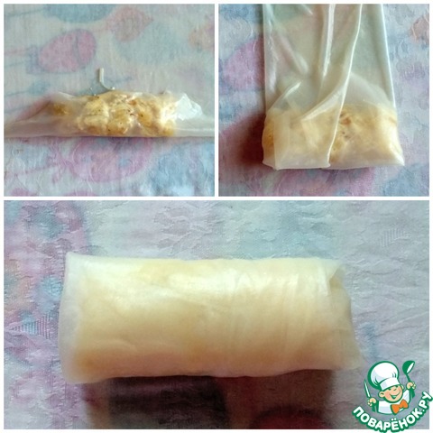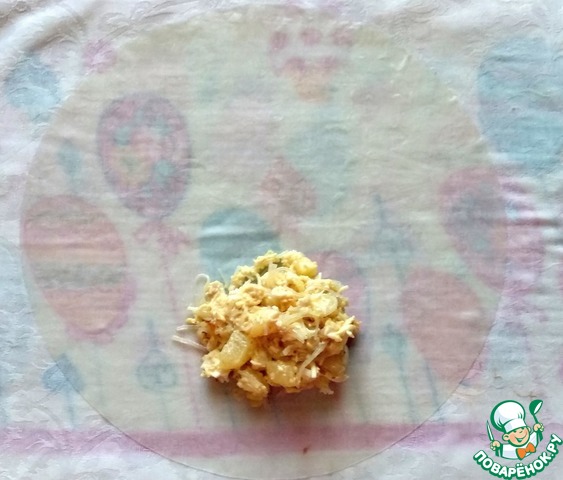 Далее будем заворачивать начинку в рисовую бумагу. С рисовой бумагой надо работать быстро, чтобы она не рвалась. Лист рисовой бумаги окунуть в теплую, кипячёную воду буквально на 2 секунды и положить его на влажное полотенце. Сверху выкладываем 1,5-2 столовых ложки начинки.