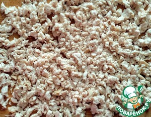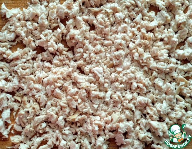Куриное филе отварить в подсоленной воде. Дать остыть, мелко порезать.
