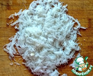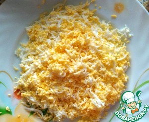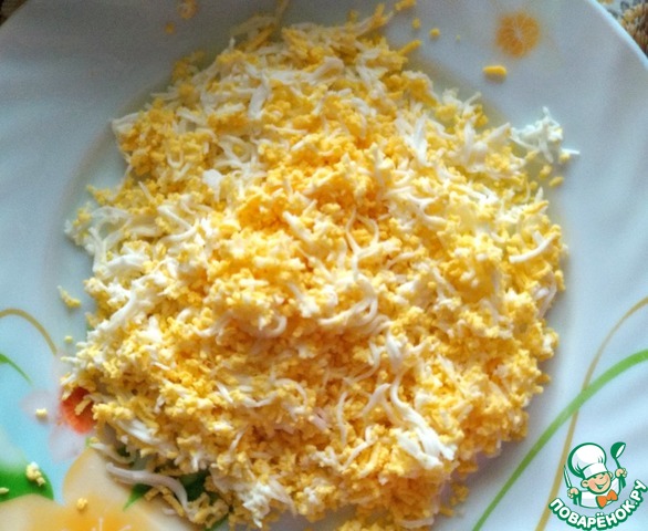 Яйца отварить, почистить и натереть на мелкой тёрке.