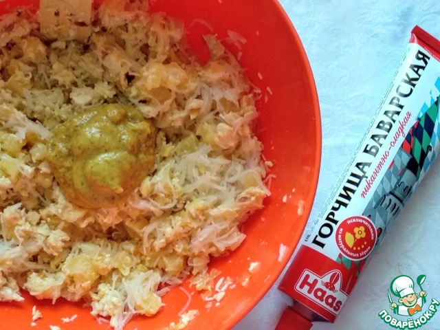 В миске соеденить куриное филе, яйца, ананасы, лук, фунчозу, перемешать. Затем добавить 2-3 ст. л. баварской горчицы (начните с двух, потом попробуйте на вкус, если потребуется добавьте ещё). Хорошо перемешать.