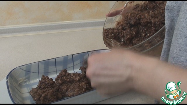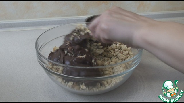 Остывший крем хорошо размешаем ложкой или миксером, чтобы был однородным. Корж разминаем руками в крошку в большую ёмкость, лучше, чтобы крошка была неоднородная, тогда будет вкуснее. Добавляем весь крем к крошке и хорошо перемешиваем.