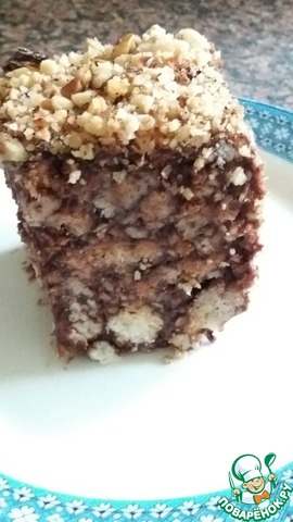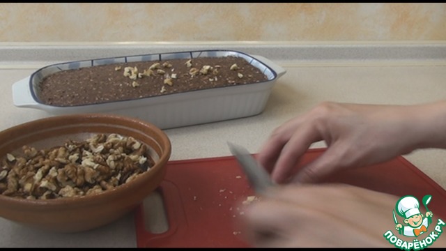 Берем блюдо или форму с высокими бортами и выкладываем наш торт, хорошо разровняв его. Я украсила измельченными грецкими орехами, но можно сделать шоколадную глазурь и залить или взбить сливки с сахаром, на ваше усмотрение.