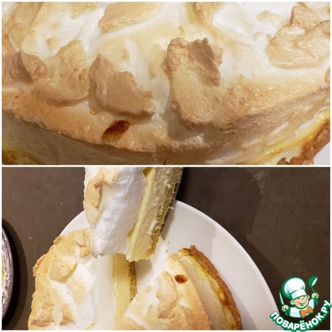 Вынуть пирог из духовки, уменьшив температуру до 160 °C. Выложить взбитые белки поверх творожного слоя.