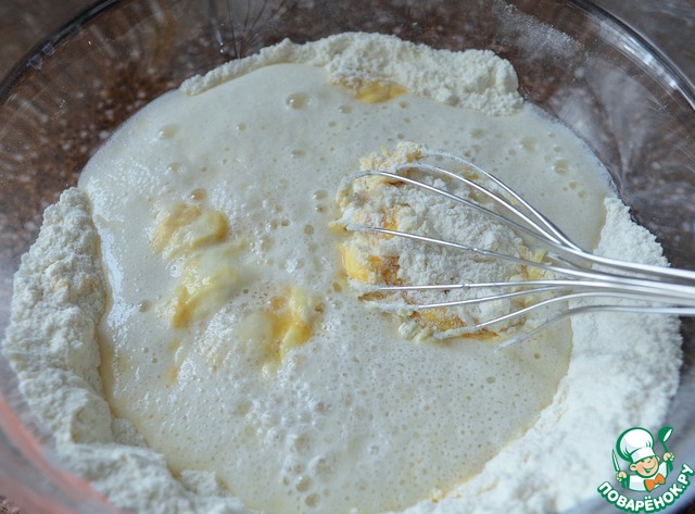 • Влить минералку и тщательно вымесить, до удаления комочков.