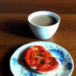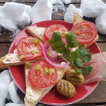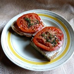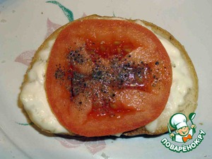 Батон намазываем этой смесью, сверху кладем кружочек помидора и посыпаем перчиком