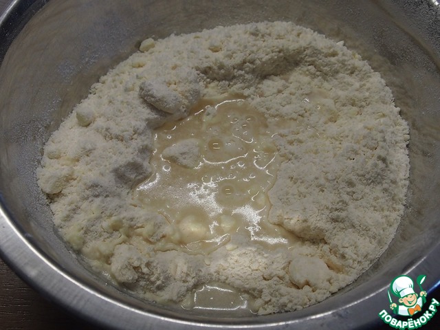 В полученную крошку добавить холодную воду (по необходимости увеличить ее количество еще на пару ложек)
